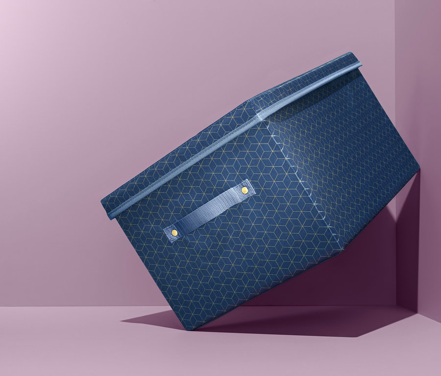 La boîte de rangement comporte deux poignées fixées avec des rivets dorés. Les parois latérales et le fond sont renforcés. Celui-ci peut aussi être retiré et la boîte est repliable pour gagner d ela place lorsqu’elle n’est pas utilisée.
