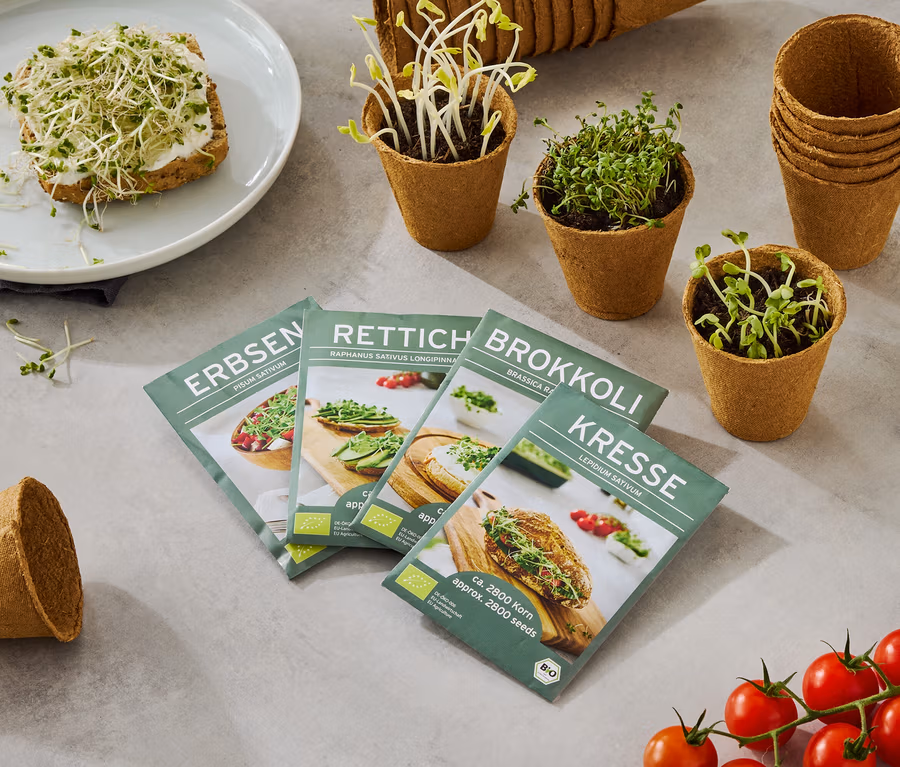 Récolte/utilisation : les pousses peuvent être récoltées après 7 à 10 jours. Les pousses de brocoli constituent un ingrédient sain pour les soupes, les salades, les « bowls » et peuvent également être utilisées comme garniture pour le pain.