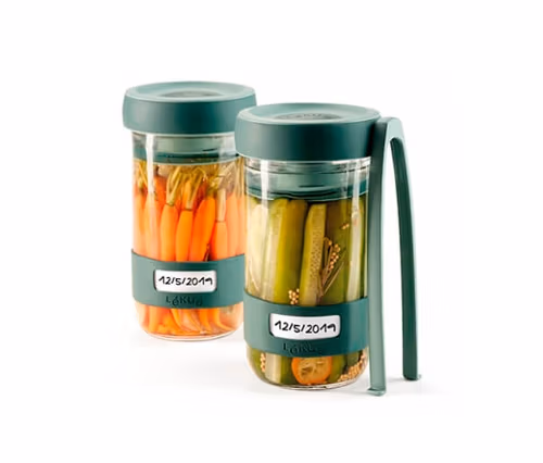 Les couvercles de fermentation comportent des valves en silicone et la plaque spéciale avec un anneau en silicone maintient les aliments marinés sous la surface liquide, ce qui est décisif pour réussir les conserves. La pince incluse permet de les mettre et de les enlever à nouveau. Les bocaux sont équipés de fermetures à visses. Grâce aux ouvertures larges, ils sont faciles à remplir et sont dotés de champs disponibles pour indiquer la date de préparation et noter le contenu. Pour commencer immédiatement, quelques idées de recettes sont déjà incluses.