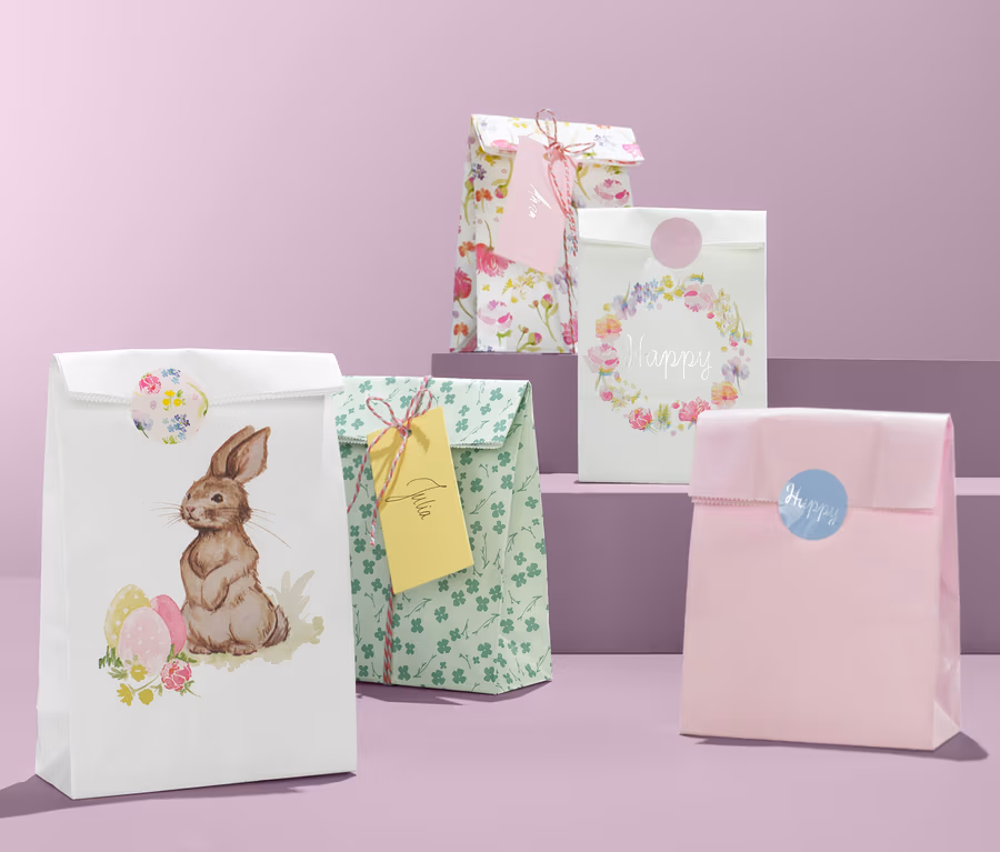 Le kit comprend 20 pochettes en papier, 20 étiquettes cadeaux et 20 autocollants ainsi qu’environ huit mètre de cordon. On peut ainsi bien emballer les petits objets ou ceux qui ont été bricolés soi-même. Avec les motifs printaniers de Pâques, les pochettes cadeaux deviennent alors une décoration d’ambiance.