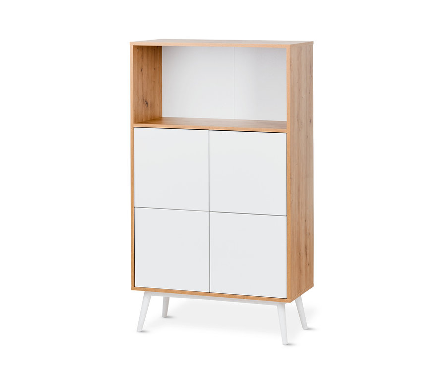 L’armoire de rangement comporte un compartiment ouvert en haut permettant de ranger tout ce que l’on utilise souvent ou que l’on apprécie d’avoir à portée de main. Elle convient aussi aux boîtes de rangement dans lesquelles se trouvent de petits accessoires. En dessous se trouve un grand compartiment derrière quatre portes pour différents accessoires de ménage et d’appareils compacts comme l’aspirateur manuel ou le fer à repasser.