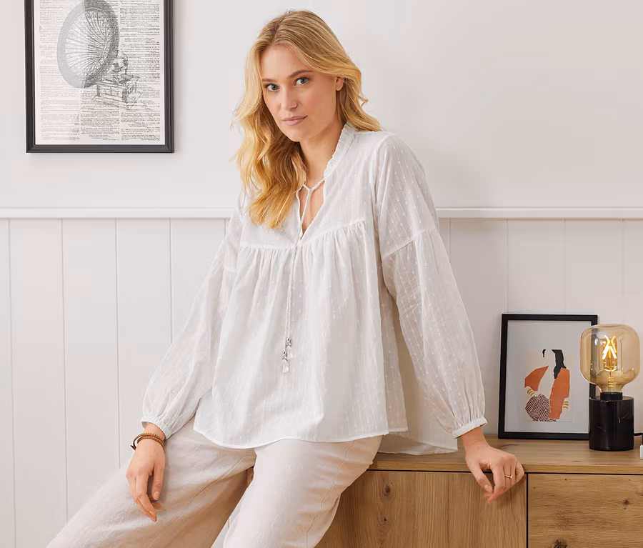 - Encolure de la tunique en V avec fronce et lien à nouer