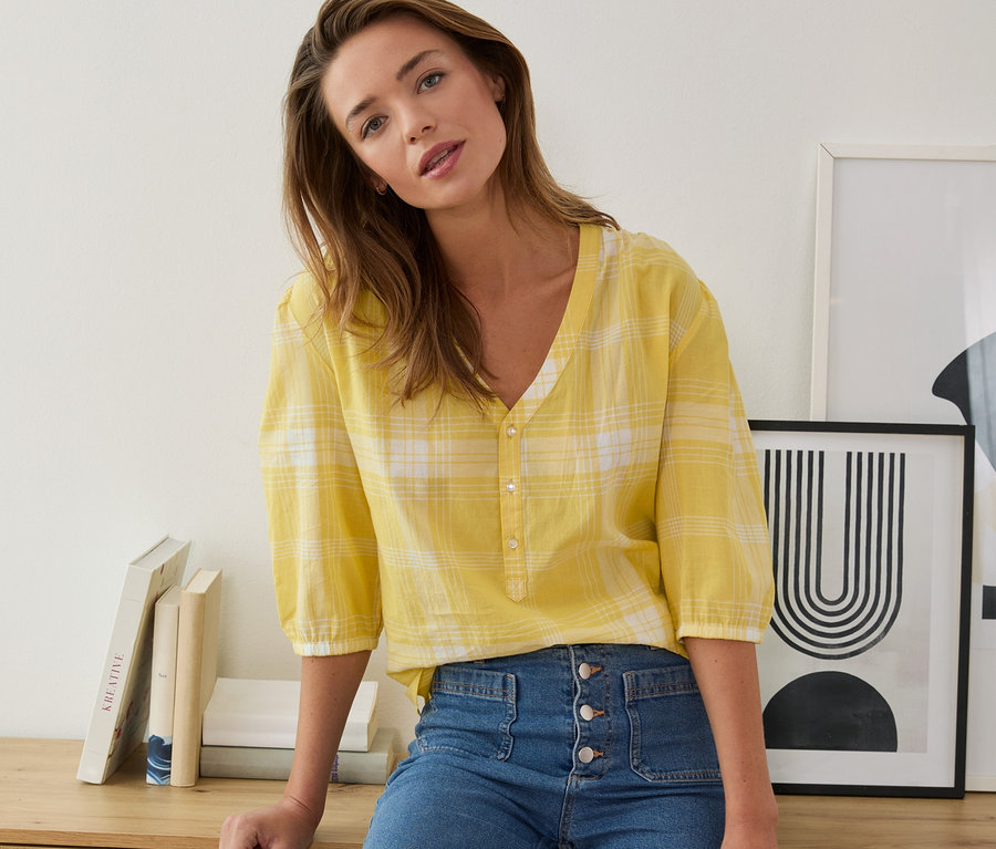 - Encolure en V avec patte de boutonnage au niveau de la poitrine