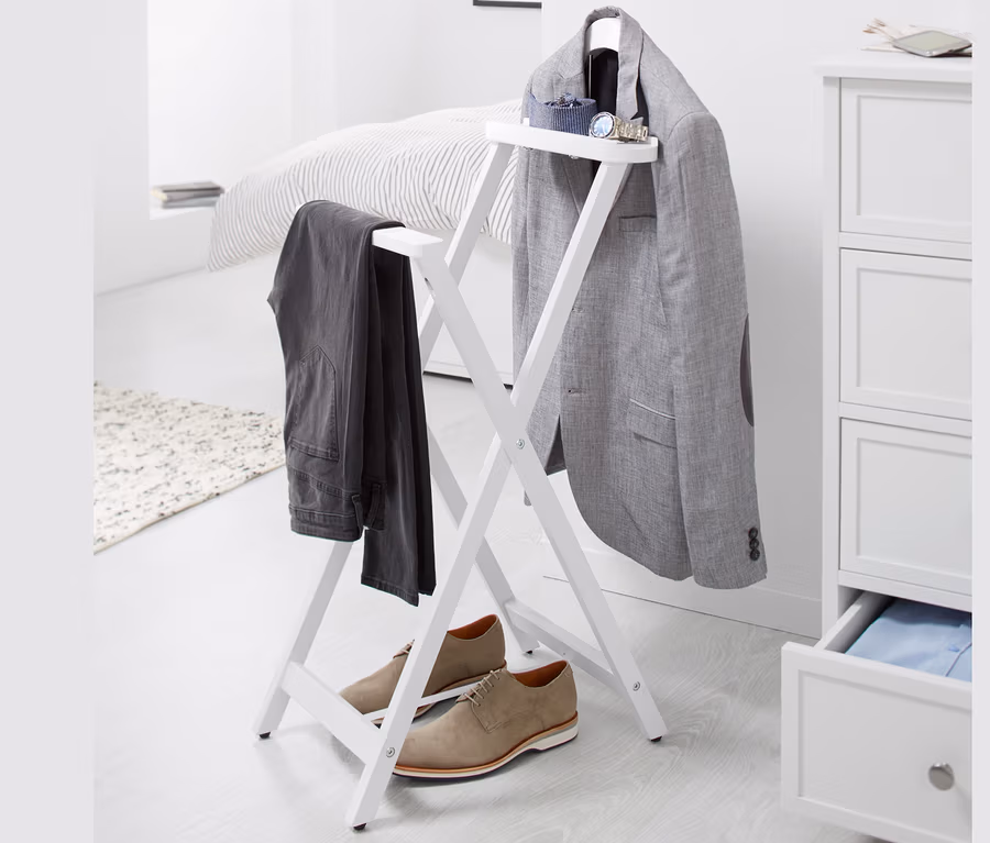 Un valet de nuit est le meuble classique dans le dressing ou la chambre. Il vous permet d'avoir les vêtements à portée de main pour le lendemain ou d'aérer une veste que vous venez de porter. Ce valet de nuit de notre belle série maison de campagne est également indémodable.