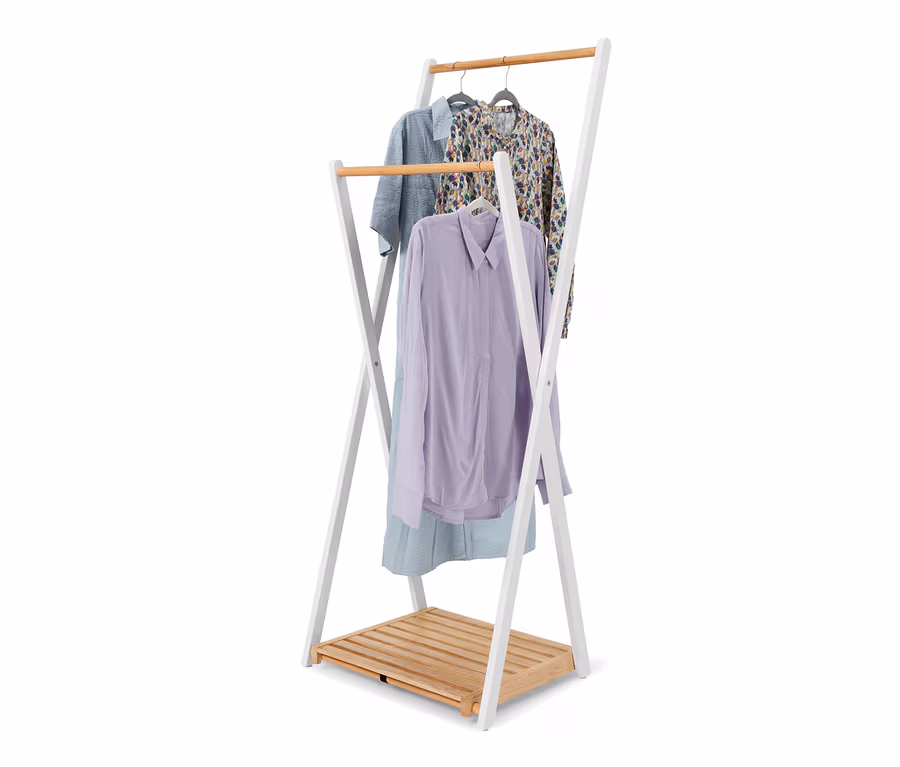 - Porte-manteau pliant avec 2 tringles à vêtements et 1 tablette en bas