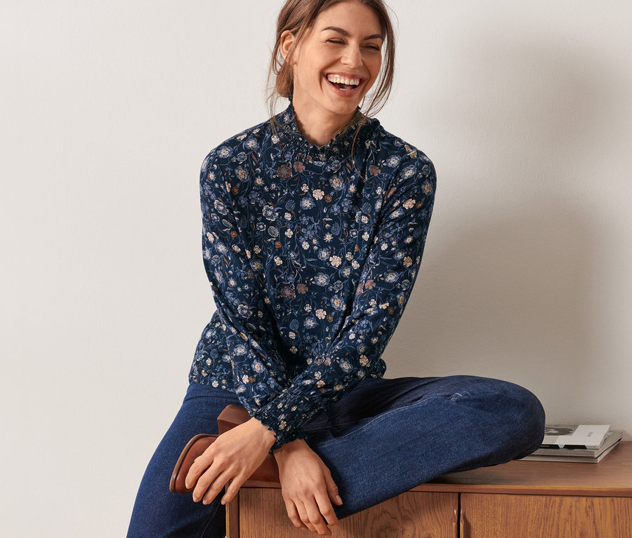 - Blouse avec un col montant ainsi que des poignets smockés et élastiques