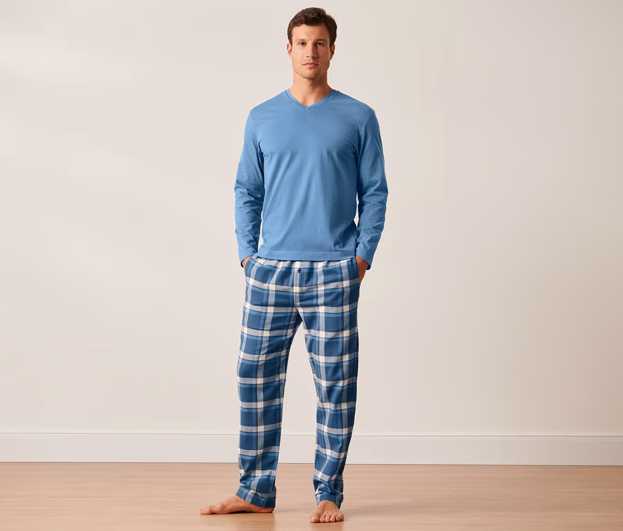 Pyjama avec pantalon en flanelle, à carreaux bleu moyen
