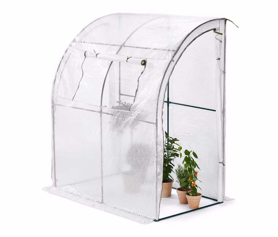 - Sans terreau pour parterre ou pelouse. Placer la serre sur les plantes et la fixer avec des crochets sur la terre
