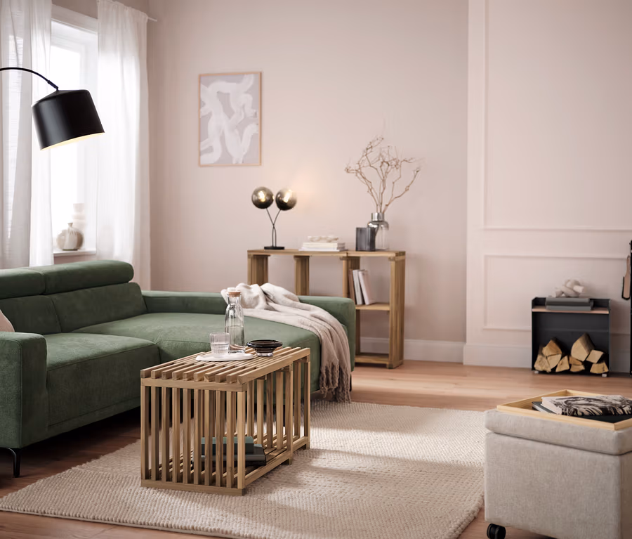 - La table basse est composée de deux parties qui s’emboîtent l’une dans l’autre et qui peuvent être utilisées en les rapprochant ou en les éloignant l’une de l’autre