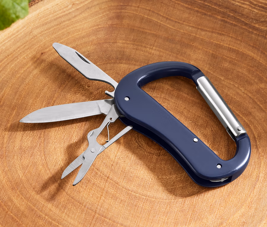 - 5 fonctions : mousqueton, ciseaux, lime à ongles, décapsuleur et couteau