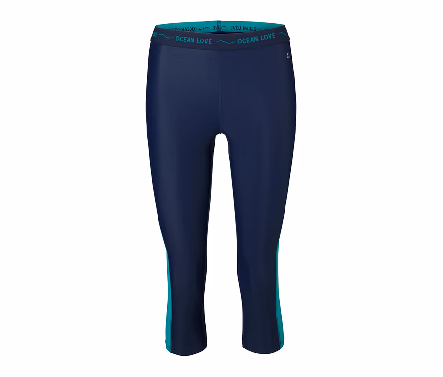 Ce legging de sport et de bain possède une taille élastique douce qui assure un bon maintien, tandis que l'élasthanne le rend indéformable et assure un confort optimal. Elle convient aux séances de running et de natation, possède des empiècements aux couleurs contrastées sur le côté, et sa taille est parée de l'inscription « Ocean Love ».