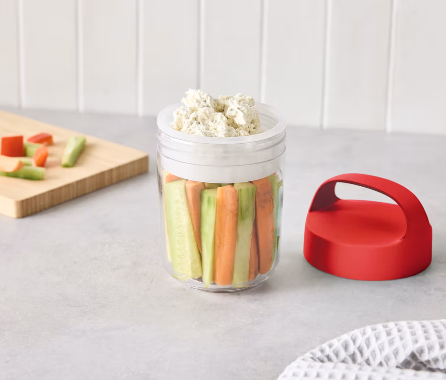 - Couvercle rouge, récipient transparent.