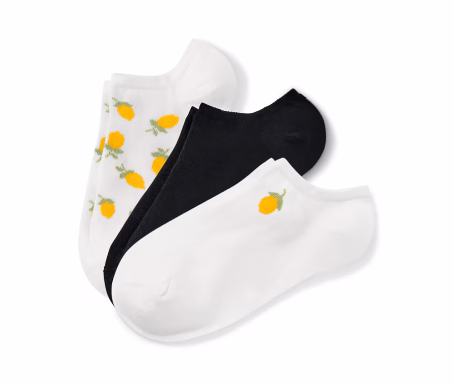 - 1 x blanc avec broderie citron placée, 1 x blanc avec motif intégral citron, 1 x noir