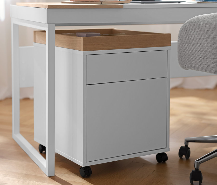 - 2 tiroirs de taille différente à ouverture partielle en appuyant dessus, avec coulisse sous tiroir