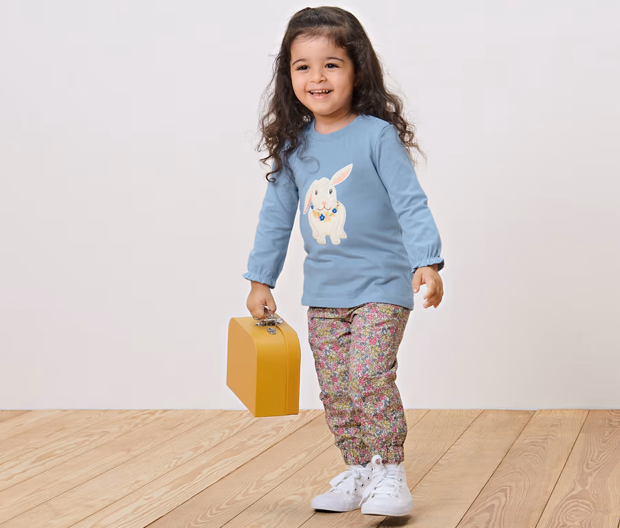 - 1x bleu clair avec application petit lapin, 1x avec imprimé intégral multicolore à fleurs