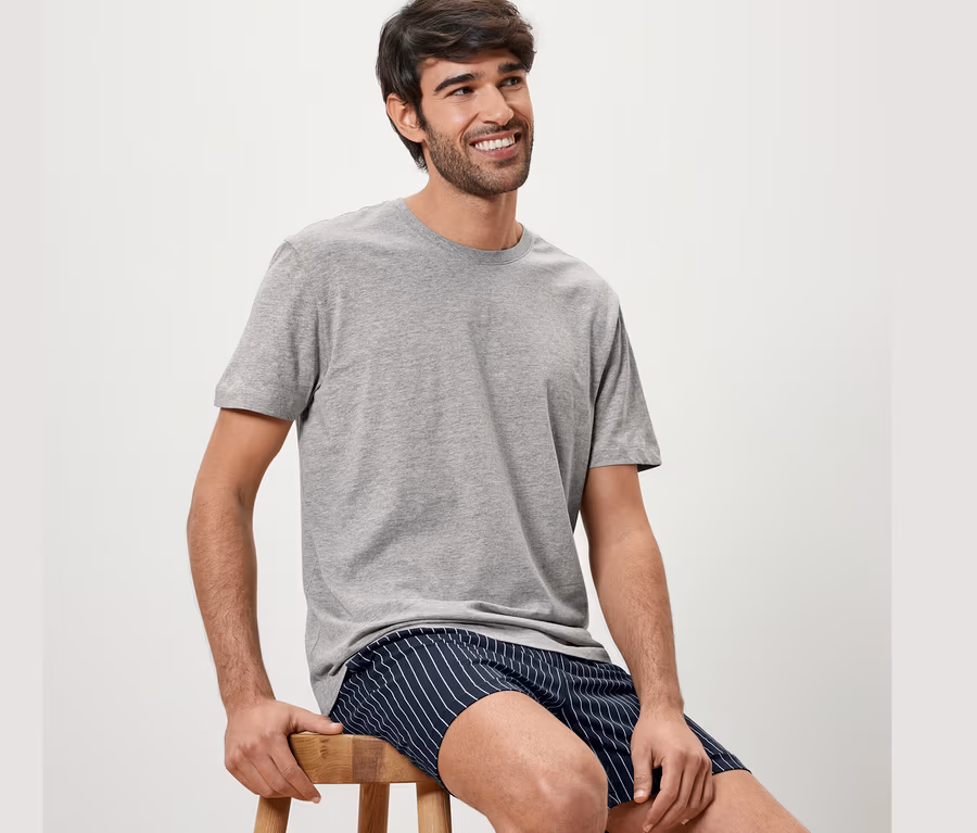 - Haut gris clair chiné. Pantalon bleu foncé-gris clair rayé.