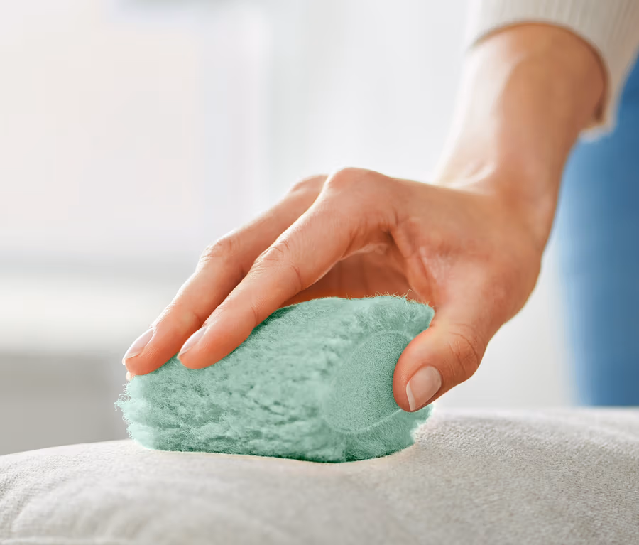 Humidifier légèrement l’éponge avec de l’eau claire et chaude. Frotter la tache en diagonale et en cercle en exerçant une légère pression.