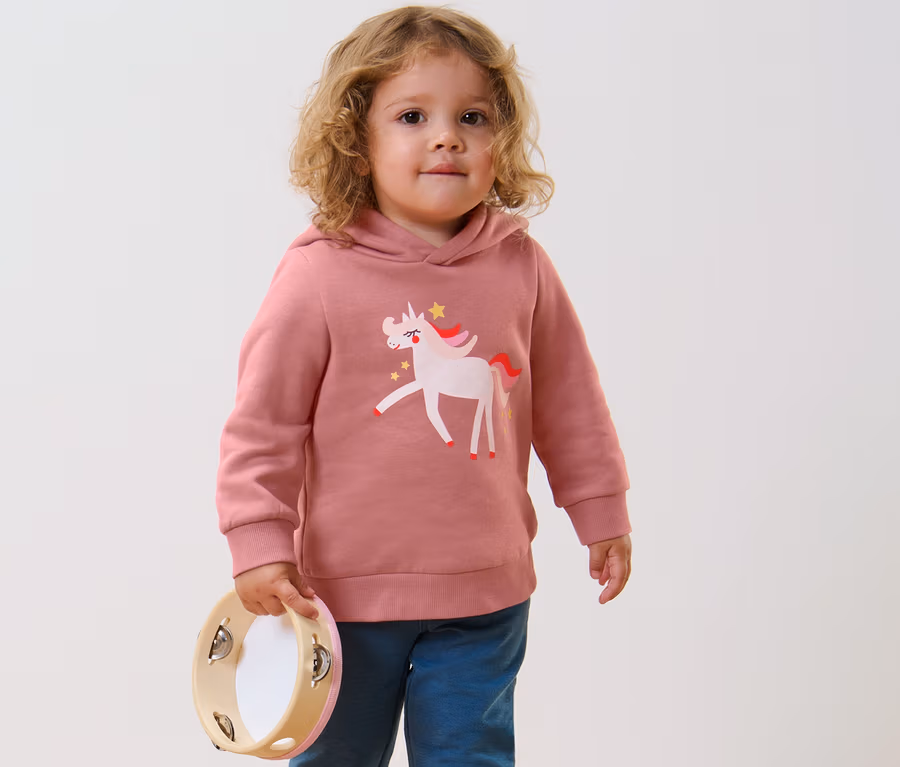 - Vieux rose avec motif licorne en paillettes réversibles, taille 86/92 avec imprimé