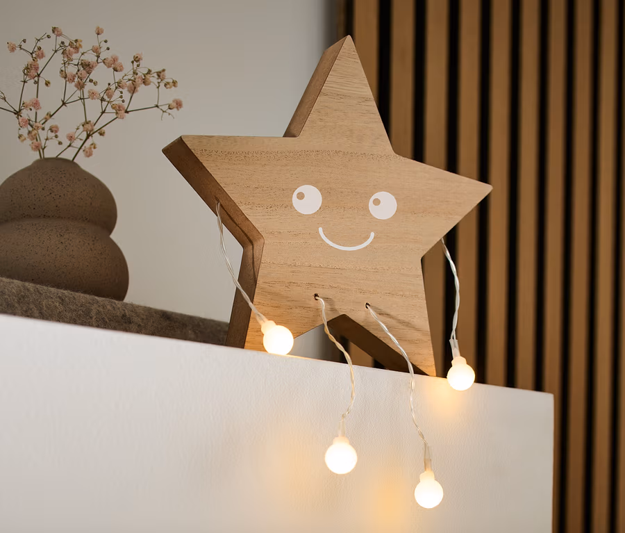 - Étoile en bois naturel avec visage blanc