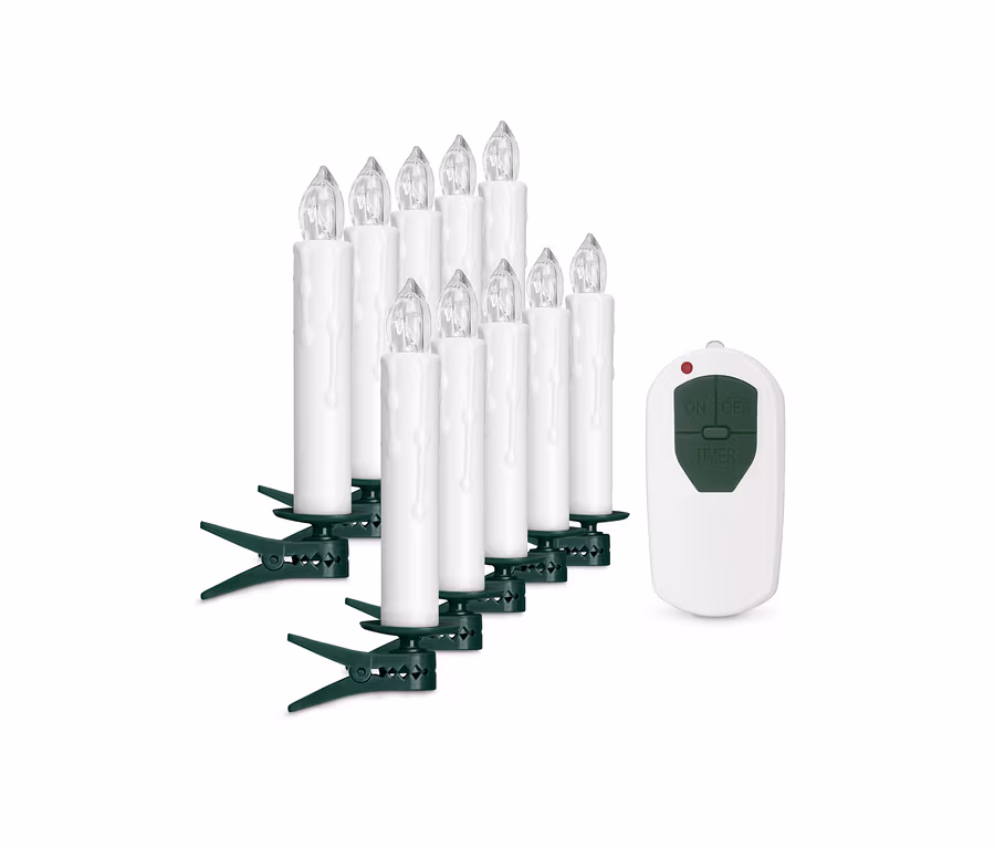Avec ces bougies, on peut profiter des plus belles surprises sans devoir penser aux mauvaises surprises sur le sapin. Les bougies à LED fonctionnent avec des piles et représentent une alternative sûre aux vraies bougies – et en même temps à une guirlande lumineuses classique avec des bougies car elles posent être mises séparément sur le sapin de et sans câble de raccordement.Pour l’intérieur et l'extérieurAvec un jeu de piles (fournies), les bougies diffusent une lumière blanche et chaleureuse pendant environ 120 heures. Grâce à la télécommande, elles peuvent être allumées éteintes confortablement. Si nécessaire, la minuterie facilite aussi les choses : les bougies peuvent s’éteindre automatiquement au bout d’environ six heures et se rallumer aussi toutes seules18 heures plus tard. Elles conviennent aussi bien dans le salon comme sur la terrasse ou le balcon. Elles sont disponibles par lot de 10 ou de 25 – pour la grande présentation.