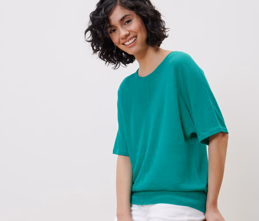 - Bords côtelés étroits à l’encolure et au bord des manches