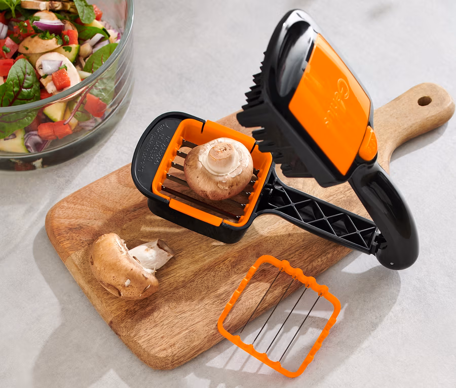 - 2 couteaux combinables inclus pour couper en tranches épaisses ou fines, en dés ou en bâtonnets – 30 dés ou 10 tranches d'un seul coup