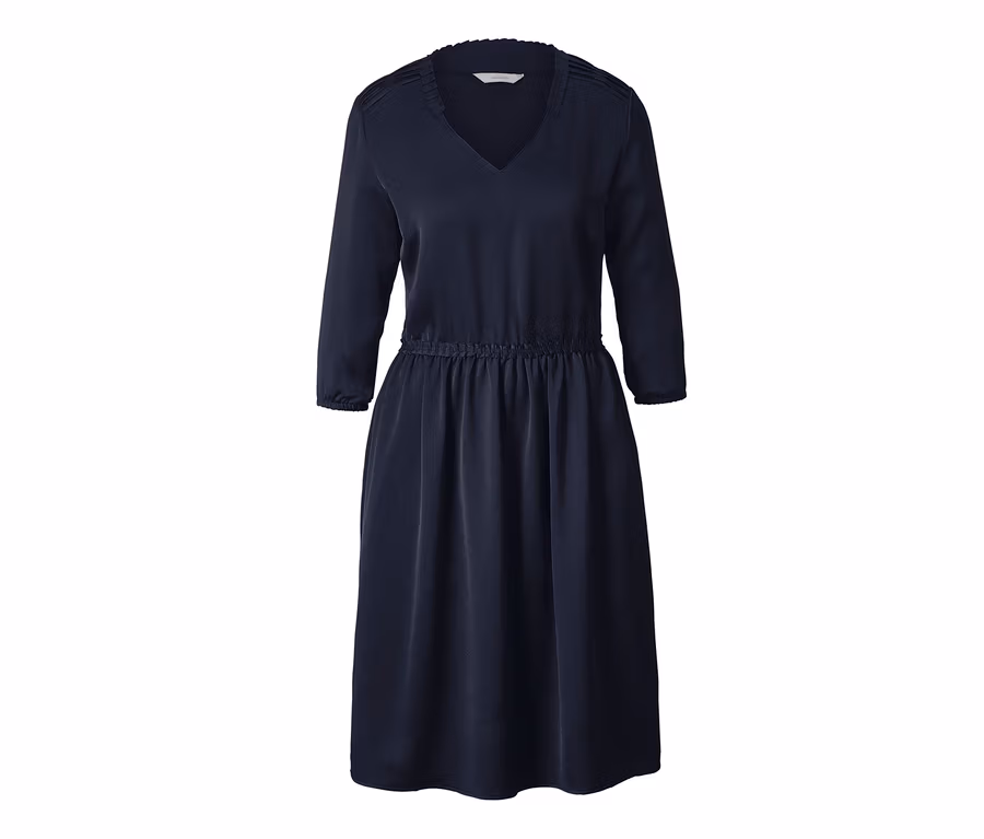 La robe est en polyester recyclé et est particulièrement douce, légère et fluide. Ses manches 3/4 ont des bords-côtes élastiques et sa taille élastique vous donnera une silhouette très féminine. La robe est légèrement brillante et la partie jupe est légèrement évasée pour un look très chic.