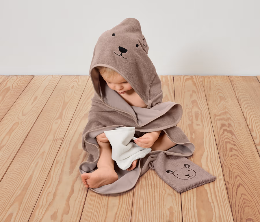 - Serviette marron clair. Gants de toilette 1 x marron clair, 1 x blanc, broderie d’ours en noir