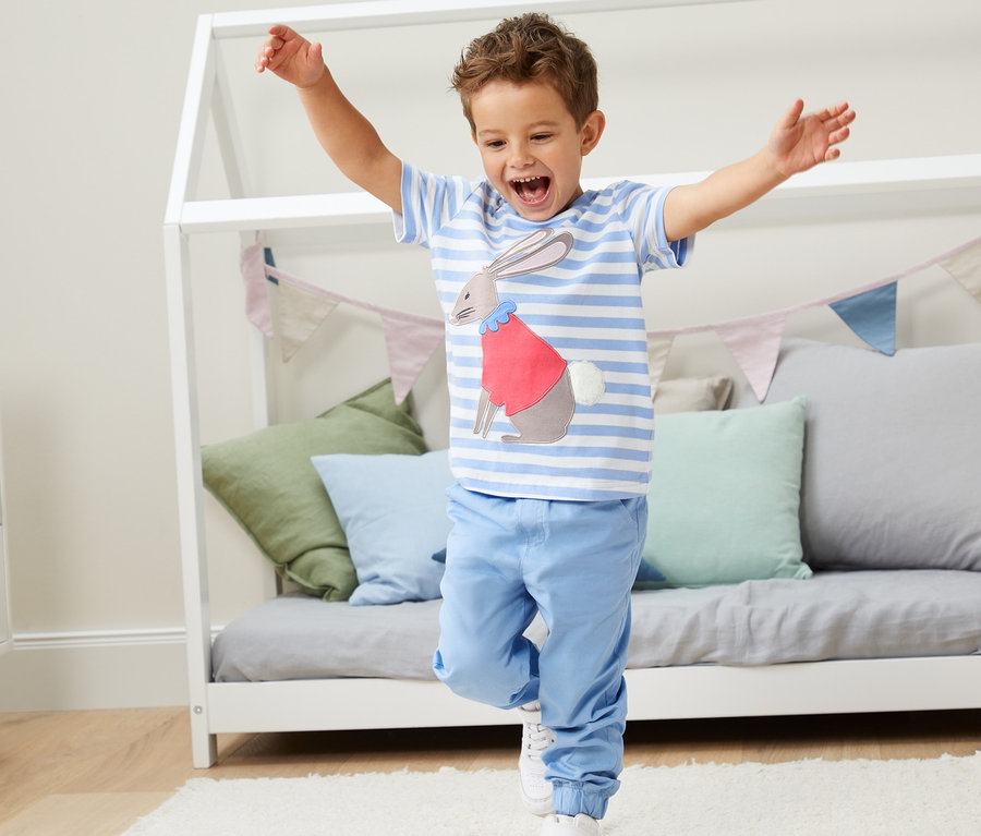 - 1x vert olive avec un petit lapin appliqué, 1x bleu-blanc à rayures avec un grand lapin imprimé
