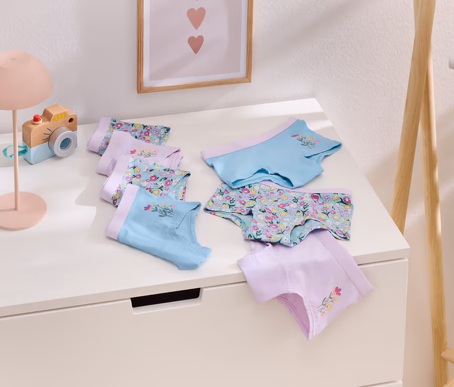 2 x lilas avec petit imprimé floral, 3 x imprimé floral intégral, 2 x bleu ciel avec petit imprimé floral