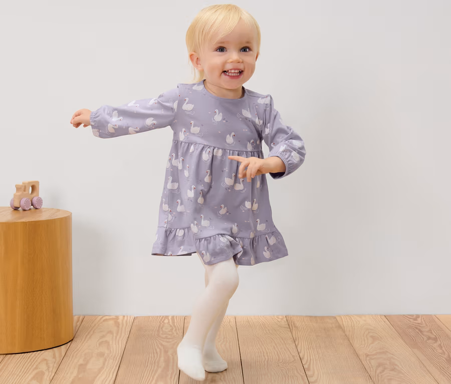 - Cette robe en jersey pour bébé soutient une culture cotonnière durable.