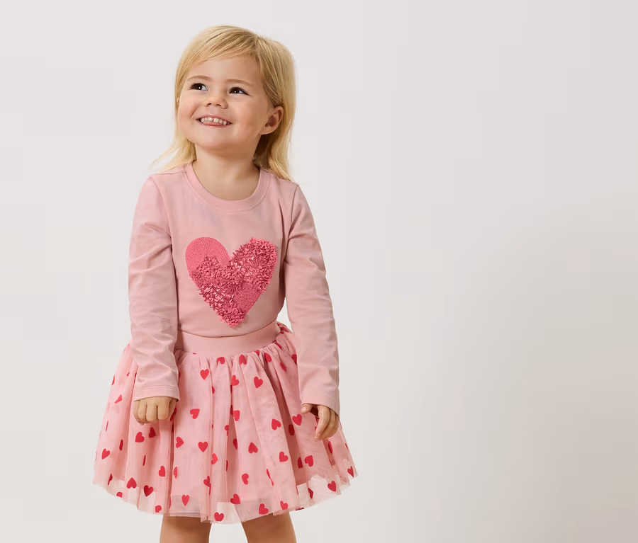 - À partir de la taille 98/104 cœur avec paillettes et application de mousseline et papillons avec paillettes réversibles