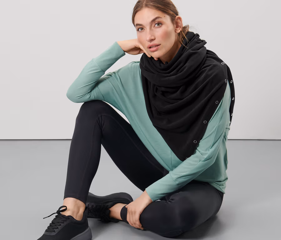 - Différentes variantes de port et d'utilisation : écharpe, cape, petit tapis de yoga