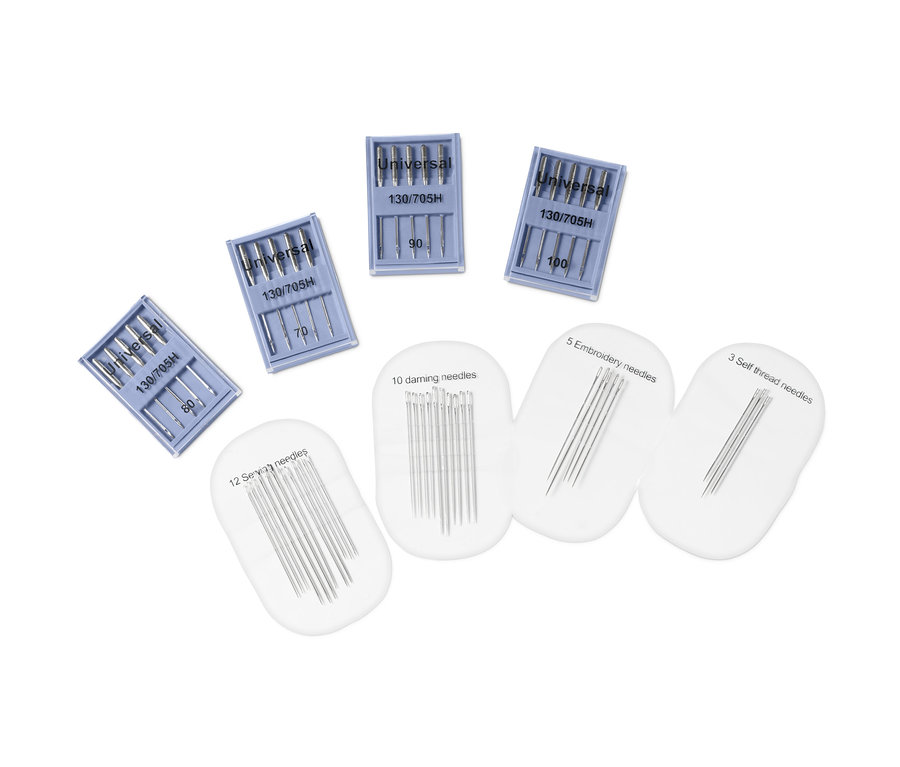 - 5 aiguilles à broder (3x S40, 1x S42, 1x S45), 10 aiguilles à repriser (4x D40, 4x D45, 2x D49,5), 12 aiguilles à coudre (3x B39, 3x S42, 3x S45, 3x S51), 3 aiguilles magiques (1x E42, 1x E39, 1x E36), 20 aiguilles pour machine à coudre (à tête plate 130R/705H : 5x universelle 70, 5x universelle 80, 5x universelle 90, 5x universelle 100) et boîte de rangement incluses