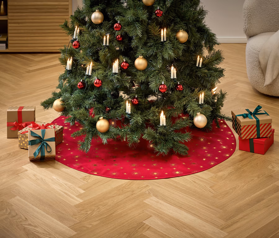 - Cache le support du sapin, les câbles, etc. – les aiguilles tombées sont récupérées