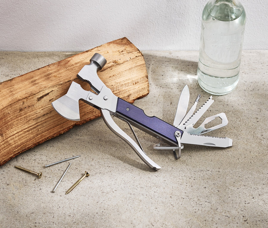 - 11 fonctions : hache, marteau, couteau lisse, pince, lime, scie à bois, scie, tournevis cruciforme, tournevis plat, clé (6, 7, 8, 10 mm) et décapsuleur