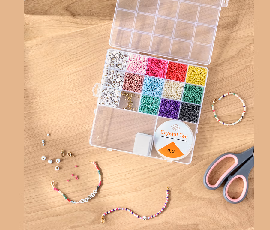Comprend 11 x 400 perles, 120 lettres et smileys en perles, fermoirs et notice de fabrication