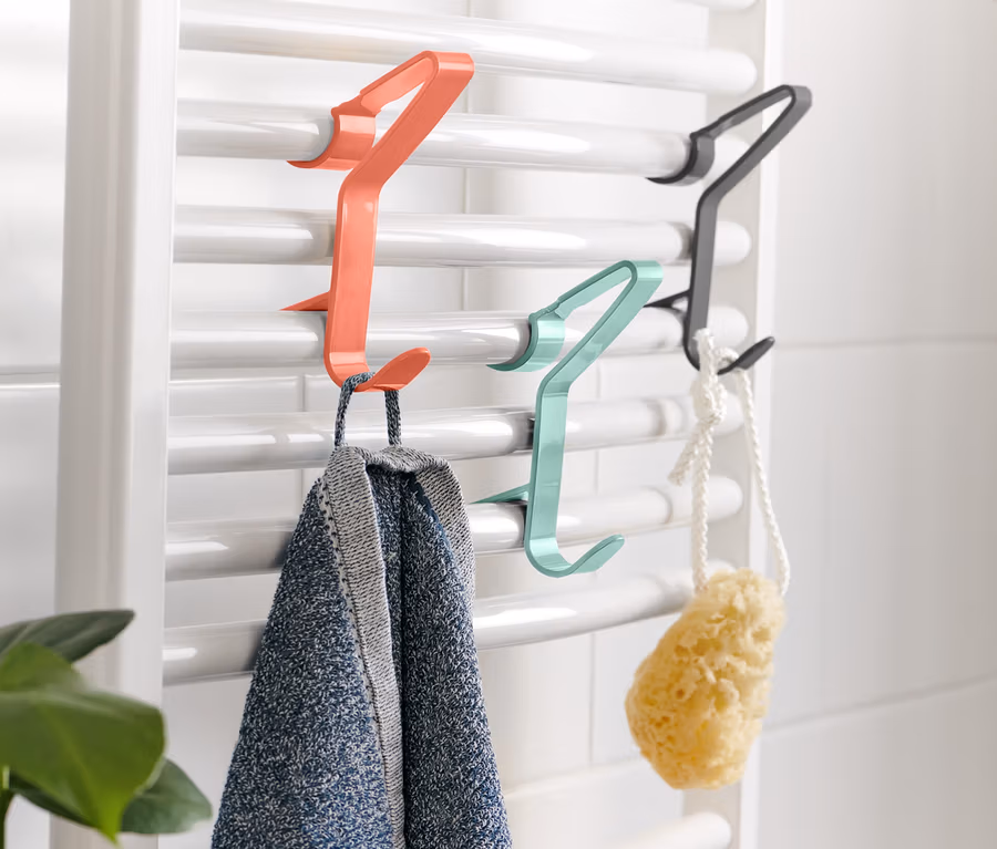 • Fixation simple : il suffit de suspendre les crochets entre les barreaux du radiateur sèche-linge