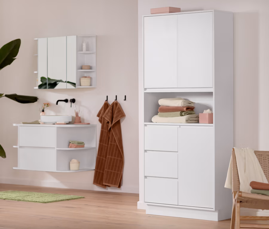 - Porte avec 2 étagères en bas à droite, 3 tiroirs en bas à gauche