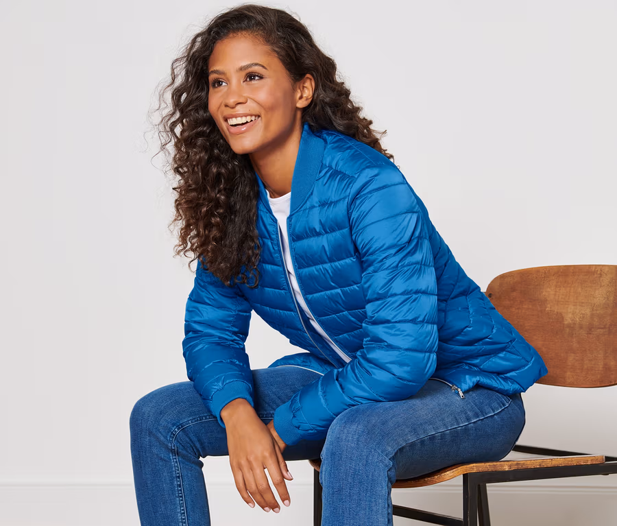 - Bords élastiques et côtelés à l’encolure et aux manches