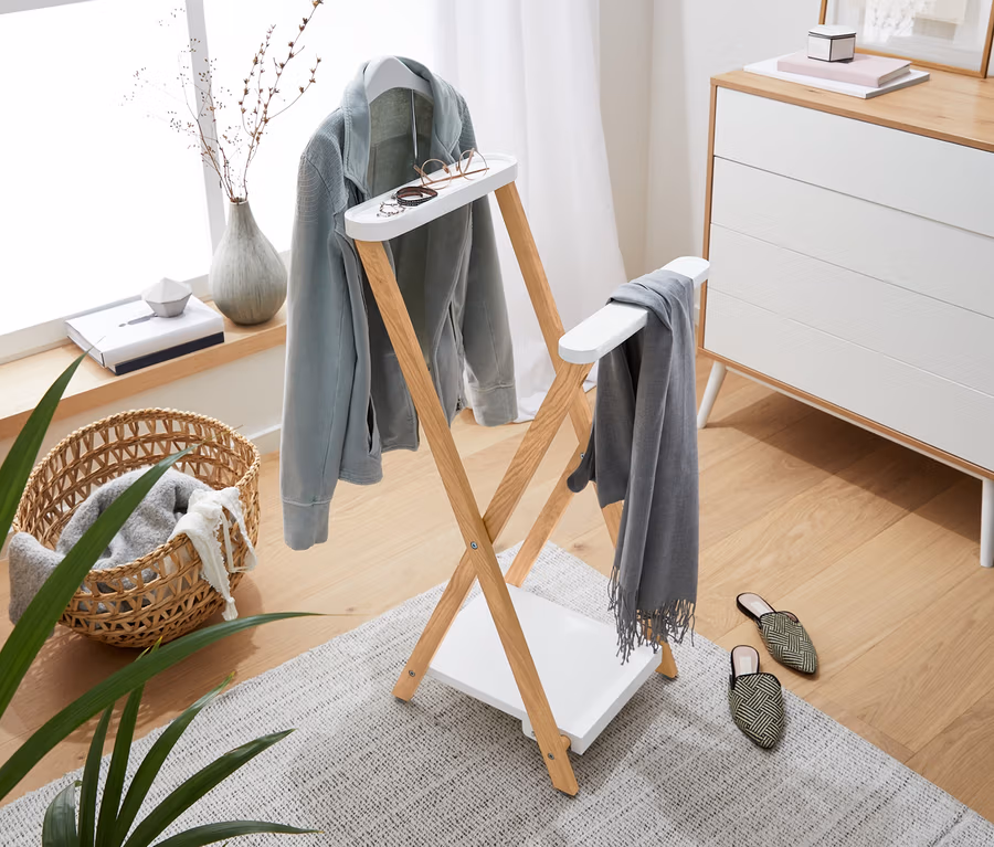 Ce valet de chambre séduit aussi par son design : ses lignes épurées lui donnent un look moderne, tandis que ses barres couleur bois lui apportent un charme naturel. Il est fabriqué à partir de bois certifié FSC®, et se replie sans prendre de place une fois que vous n’en avez plus besoin. Mais vous pouvez aussi le laisser tel quel pour décorer votre pièce.