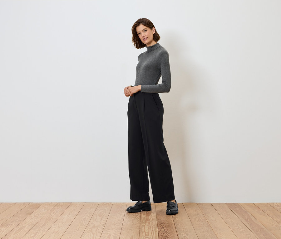 - Taille élastique avec boucles de ceinture, fermeture éclair, un crochet et un bouton dissimulé