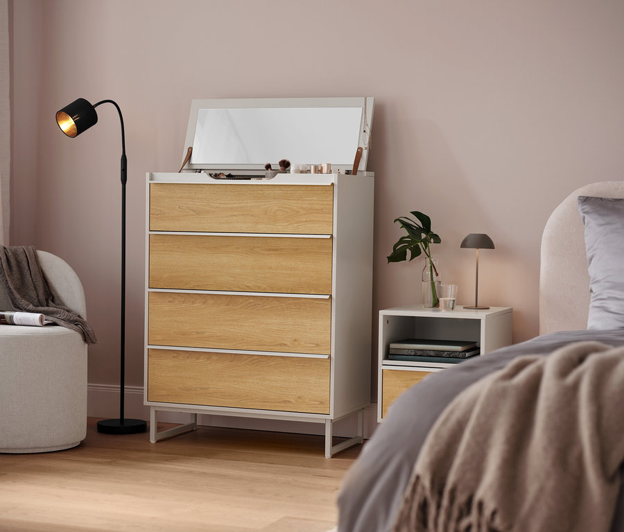 Miroir rabattable avec compartiment, 4 tiroirs avec poignée métallique et fermeture soft-close
