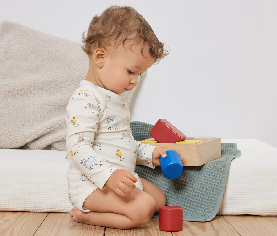1 x blanc crème avec imprimé intégral animal multicolore, 1 x bleu pigeon avec imprimé poussin, 1 x bleu ciel