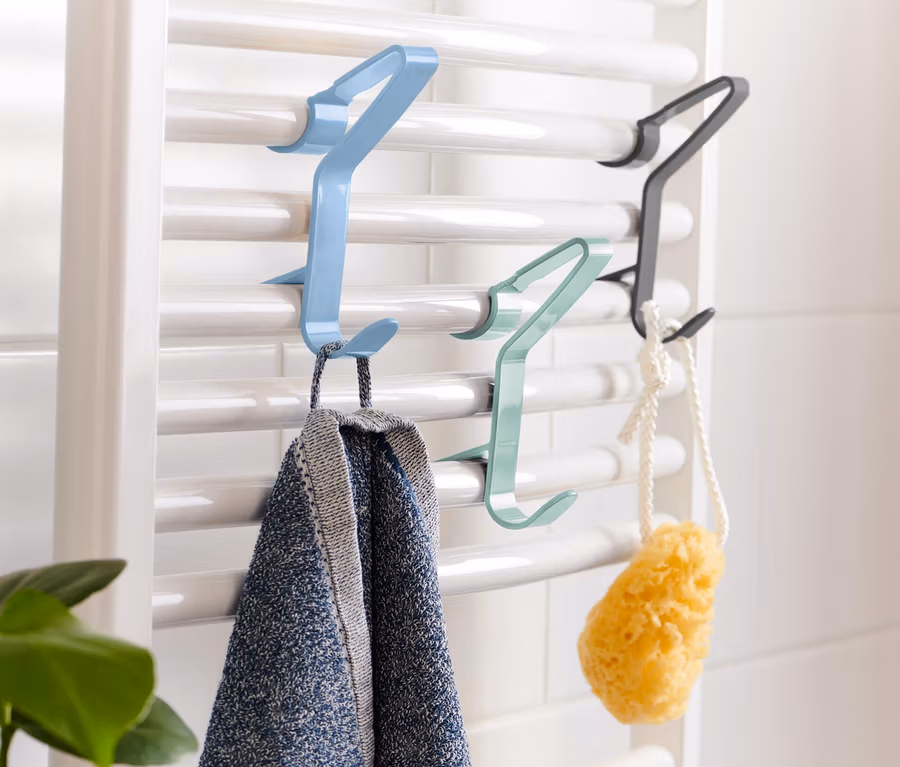 - Fixation simple : il suffit de suspendre les crochets entre les barreaux du radiateur sèche-linge