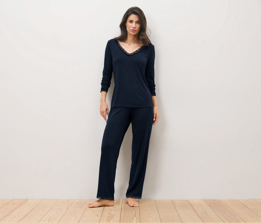 - Parementure en dentelle délicate au niveau de l’encolure en V, aux extrémités des manches et au bas des jambes