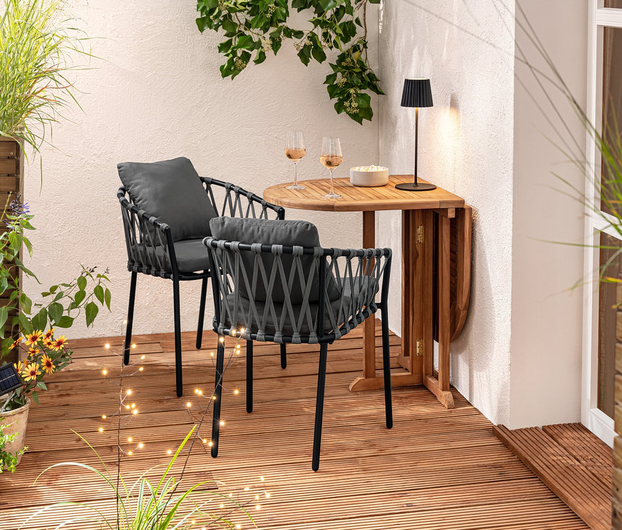 - Coque d’assise en tressage textile résistant aux intempéries et à séchage rapide, adaptée à l’extérieur