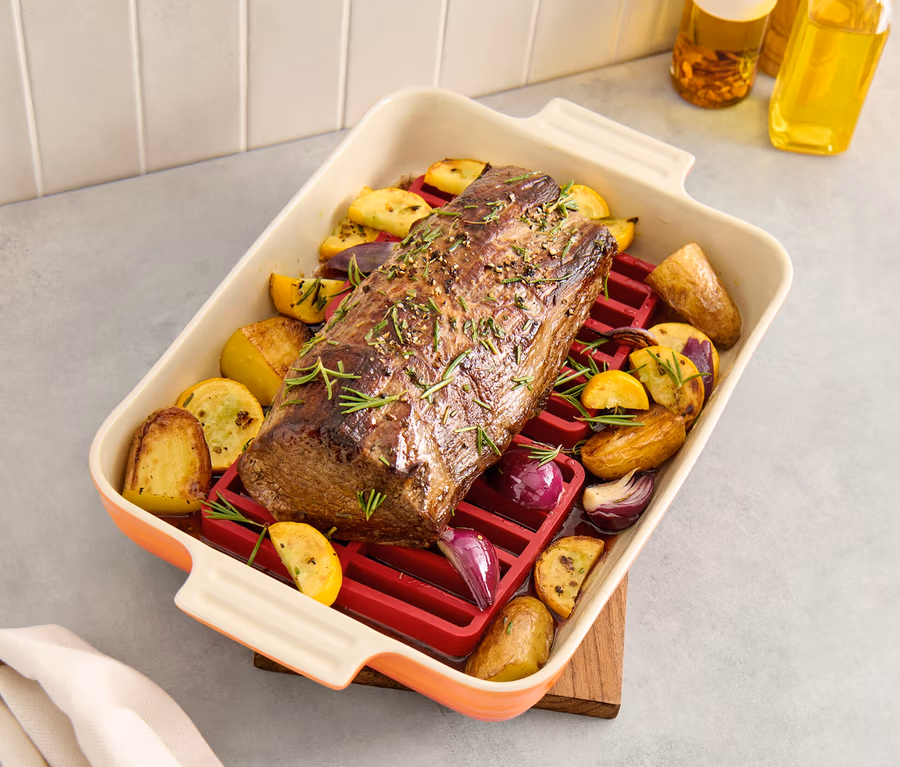 - Surélève les aliments afin qu’ils soient placés au-dessus des graisses et des jus de cuisson, permettant ainsi une cuisson plus saine