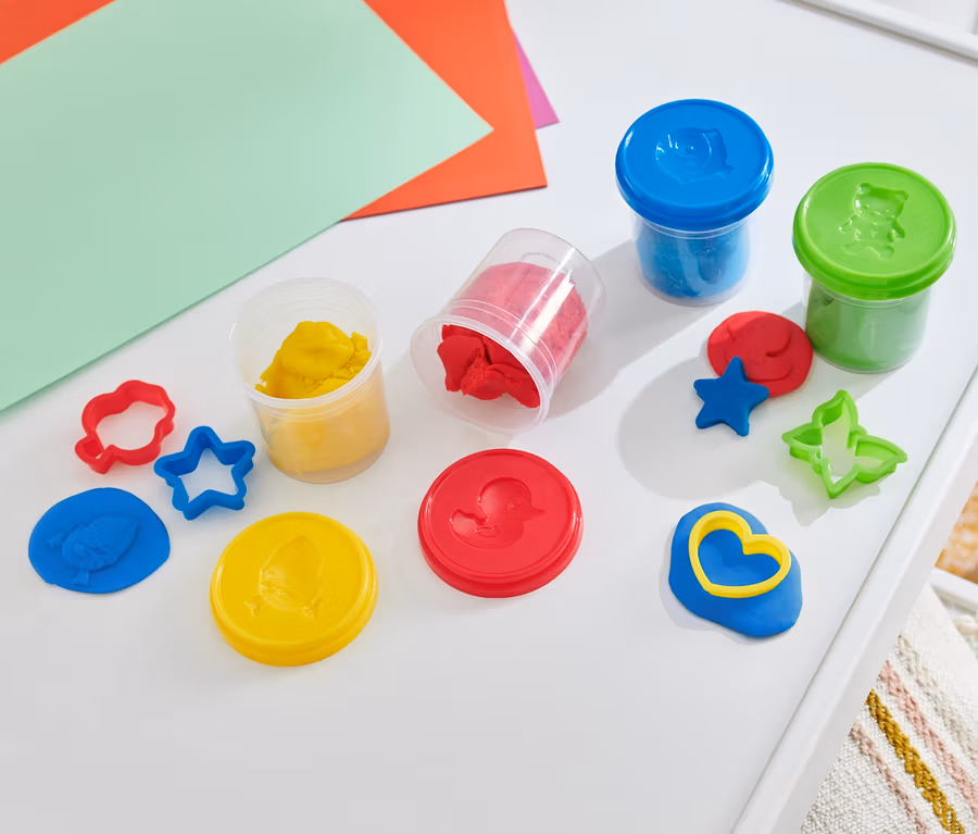 - 4 pots de 140 g de pâte à modeler en différentes couleurs : avec 4 motifs 2D dans le couvercle et 4 emporte-pièces supplémentaires