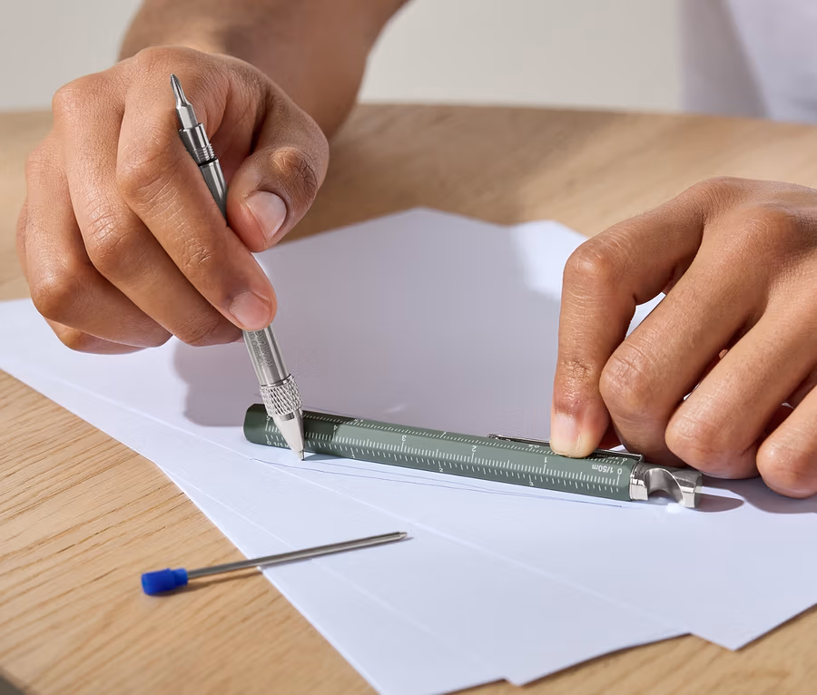 - 5 fonctions : stylo à bille, décapsuleur, règle, tournevis cruciforme et tournevis plat